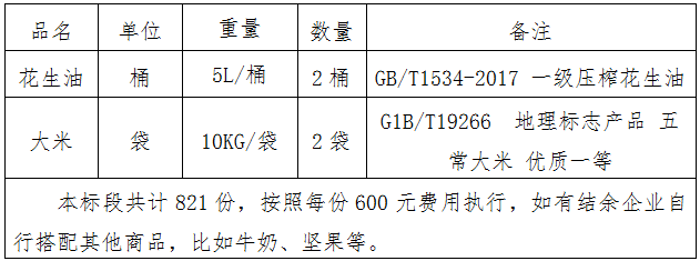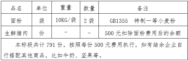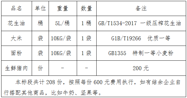 2.项目内容:大米、面粉、食用油,生鲜猪肉等,分三个标段进行招标,各企业可根据自身情况进行投标。第一标段:花生油和大米,按照人均600元费用执行;第二标段:面粉和生鲜猪肉,按照人均500元费用执行;第三标段:米、面、食用油、猪肉,按照人均600元费用执行。三个标段的具体情况分别如表1、表2和表3。