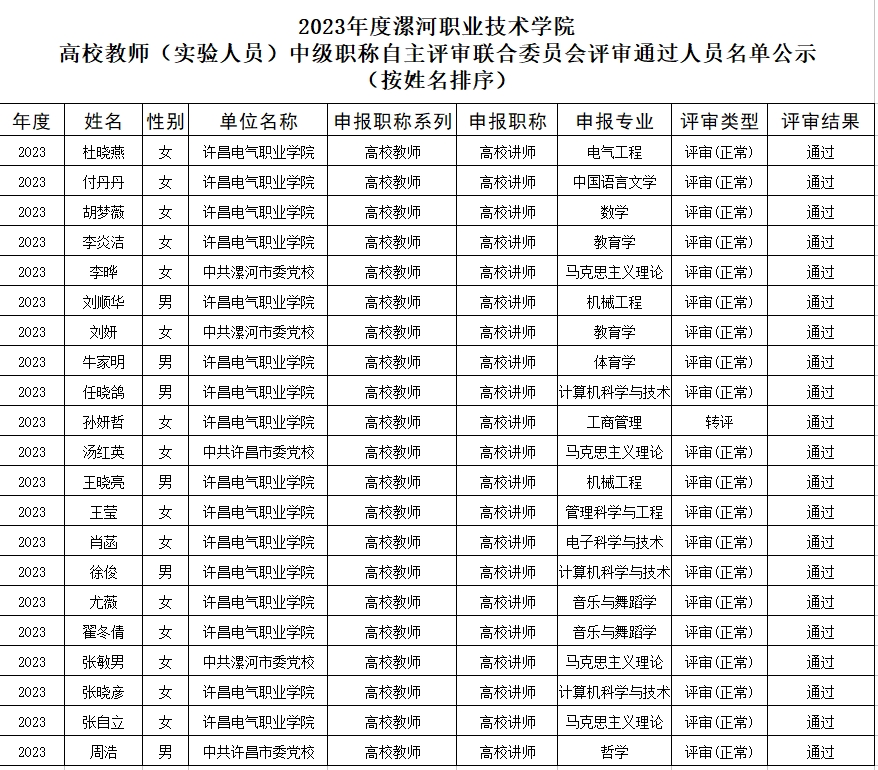 根据2023年省、市职称工作精神,2023年12月26日至27日召开了2023年度best365官方网站登录入口高校教师(实验人员)高级职称自主评审委员会和best365官方网站登录入口高校教师(实验人员)中级职称自主评审联合委员会,现将评审会承办单位参评人员及受理委托评审人员评审通过结果进行公示,欢迎广大教职工给予监督,如有异议,请向best365官方网站登录入口职称评审改革领导小组办公室(下简称漯职院职改办)提出,漯职院职改办将集中复核。