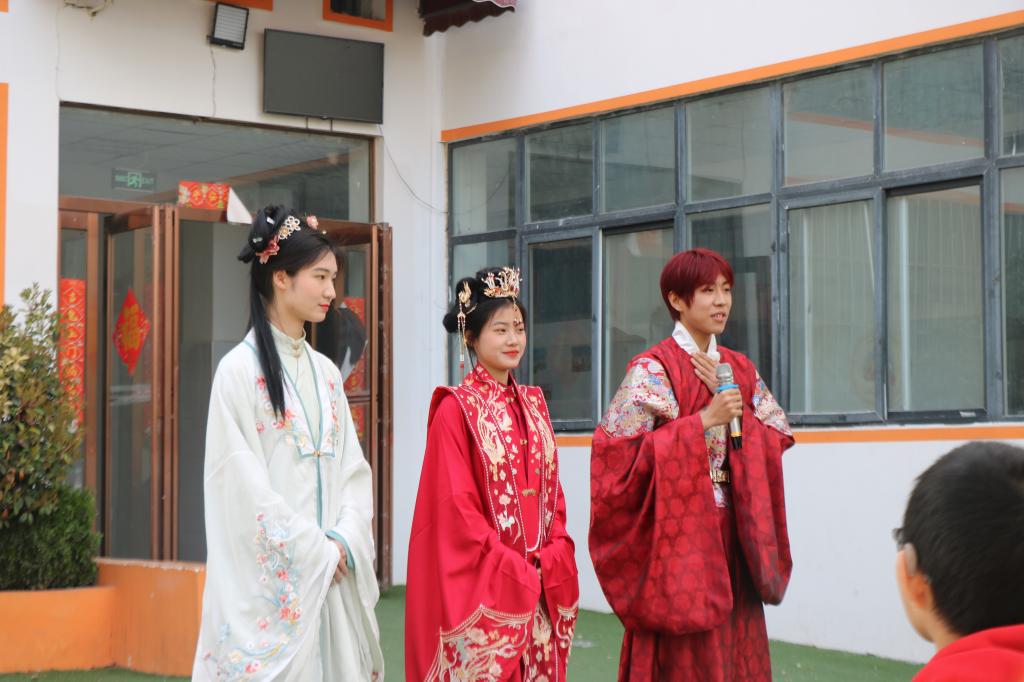 青年志愿者给孩子们讲解了汉服知识、表演了汉服舞蹈;演唱了《大鱼》、《明天会更好》等歌曲,最让孩子们开心的是“舞狮”表演,大狮子和小朋友们开心的互动,引起孩子阵阵的欢呼声,也拉近了志愿者与孩子们的距离。表演结束后,志愿者们又为孩子们分发了书包、彩笔、羽毛球、乒乓球等文体用品,孩子们开心地将手中的礼物高高举起,脸上洋溢着兴奋的笑容,一张张纯真的笑脸感染了在场的所有人。