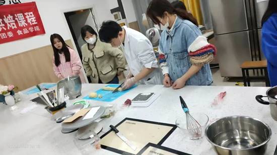 接着他给大家进行了示范,在操作的过程中又讲解了原料比例、工具使用、烘烤的温度和时间等细节步骤 。