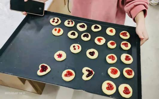 听完老师的讲解,大家将小块的面团轻轻揉捏成圆窝状,在烤盘上码放整齐,再均匀地挤上蓝莓酱、草莓酱,放入烤箱中烘烤。香喷喷又可爱的小饼干新鲜出炉啦!同学们很喜欢。