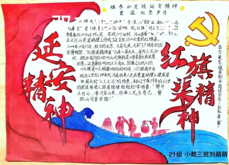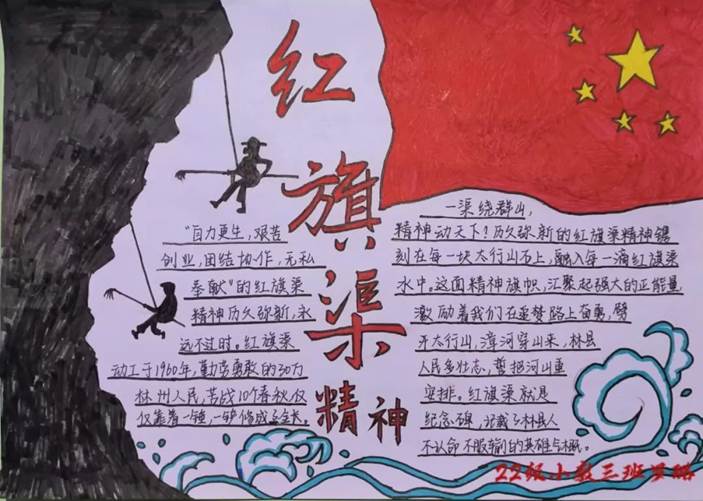 为深入学习宣传党的二十大精神,贯彻落实习近平总书记视察河南安阳重要讲话精神,用红旗渠精神教育广大青少年,弘扬革命传统,传承红色基因,培育时代新人,近日,我校团委开展了“红旗渠精神”手抄报绘制活动,进一步学思践悟红旗渠精神。