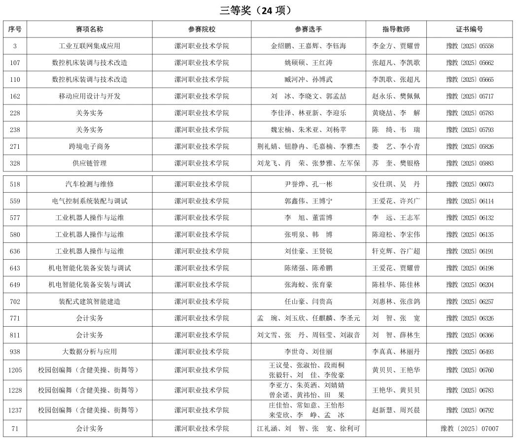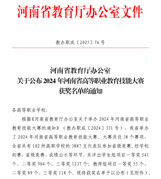 近日,河南省教育厅办公室公布2024年河南省高等职业教育技能大赛获奖名单。best365官方网站登录入口在本次大赛中表现卓越,共斩获奖项55项,其中一等奖12项、二等奖19项、三等奖24项,获奖总数及质量均创历史新高。