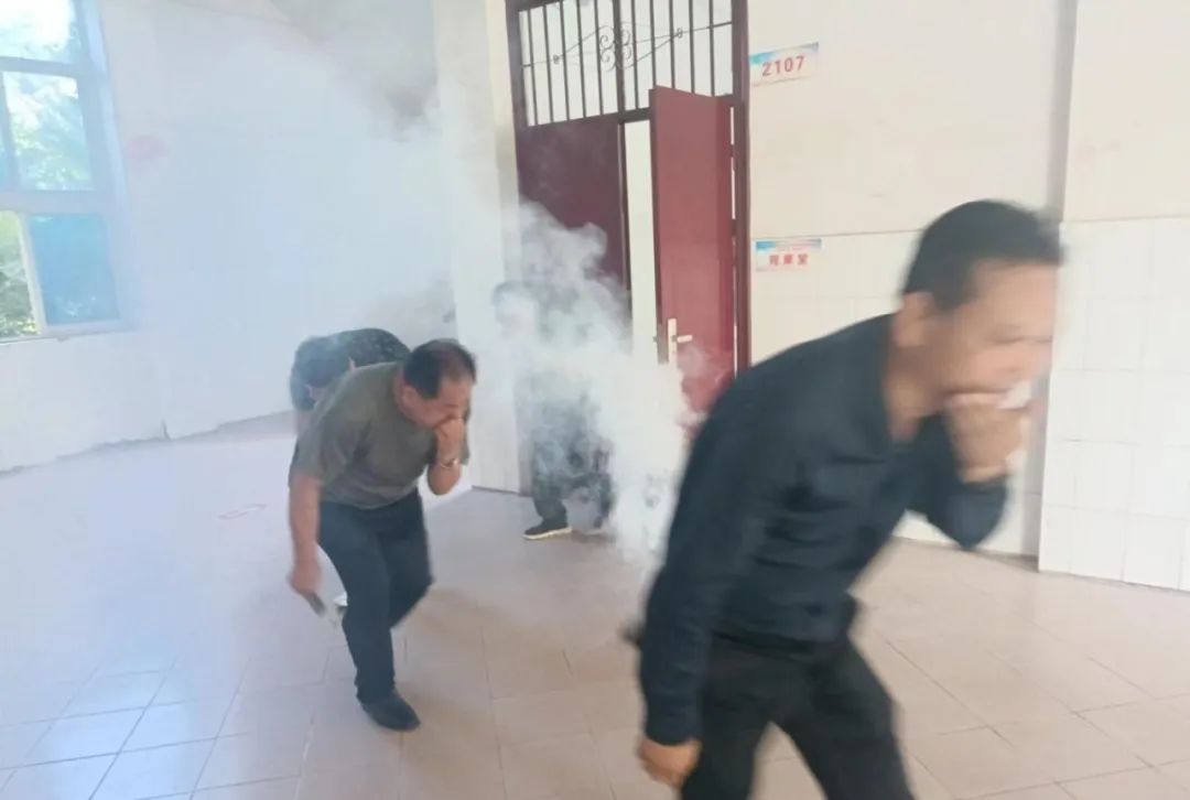 在疏散演练环节中,参会人员在弥漫烟雾里进行模拟火场逃生演练。